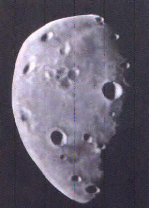 Der kleine Marsmond Deimos misst 16 x 12 x 10km, er umkreist den Planeten in einer Entfernung von 23.500km, ein Umlauf dauert 30 Stunden, 18 Minuten.