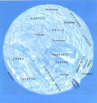 Miranda ist mit 562 km Durchmesser der kleinste der fünf großen Unranusmonde. Die Aufnahmen von Voyager 2 haben gezeigt, dass es sich hier um einen der bizarrsten Körper im Sonnensystem mit überraschenden Zeichen einstiger geologischer Tätigkeit handelt. Hier gibt es zunächst einmal zwei grundlegend voneinander verschiedene Oberflächentypen: ein altes, leicht gewelltes, kraterübersätes Gelände und ein junges Terrain mit zahlreichen Brüchen, Schründen, Systemen von niedrigen parallelen Rücken und Furchen, dunklen und hellen von Oval- oder Parallelogrammform werden auf der Miranda-Karte als "Corona" bezeichnet. Sie sind wahrscheinlich Resultate eines vom Corona-Zentrum ausgehenden, bis zu den Rändern verlaufenden Prozesses. Beachtenswert sind ferner die Systeme der tektonischen Verwerfungen, die wie riesige Canons oder Gräben aussehen, 10-15 km tief und von bis zu 20 km breiten Steilhängen eingefasst. Das mächtigste von ihnen beginnt an den beleuchteten Hängen Verona Rupes und setzt sich längs der Ränder von Invernes Corona und Arden Corona bis an den Rand der Miranda-Scheibe fort.