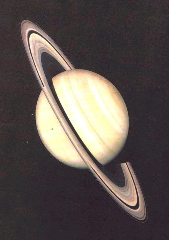 Am oberen Bild erkennt man links von der Planetenscheibe die Monde Tethys und Dione.